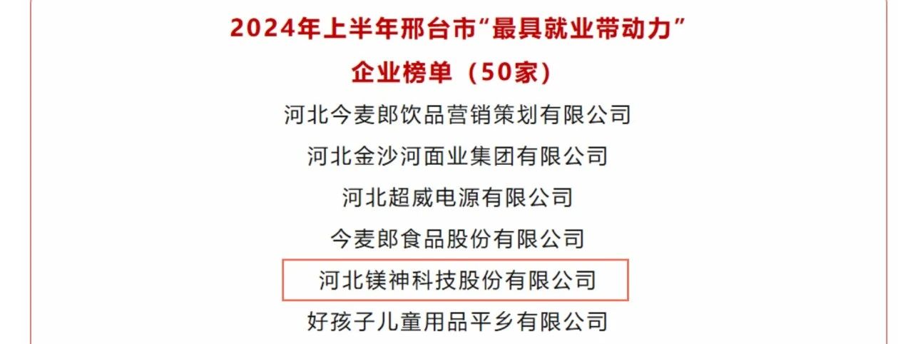 2024年7月15日 邢臺(tái)市人社局發(fā)布 邢臺(tái)市“最具就業(yè)帶動(dòng)力”企業(yè)榜單 河北鎂神科技股份有限公司榮譽(yù)上榜 ..